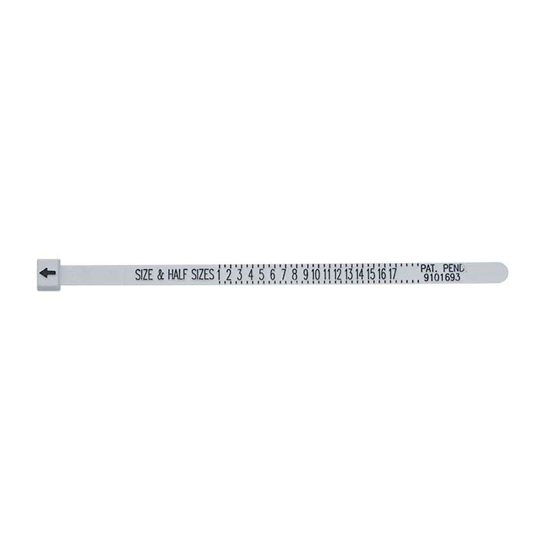 This adjustable finger gauge is perfect for determining your ring size from the comfort of your own home. The plastic finger gauge measures U.S. sizes 1–17 in half-size increments. Simply wrap it around your finger and tighten until the sizer is comfortably tight. It should not be too tight, but you should have to wiggle the sizer over your knuckle a little.